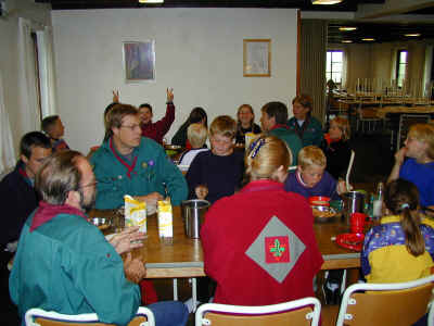 I køkkenet er der travlhed. Selvom juniorer og spejdere selv laver mad over bål, så skal maden fordeles og ulvene (og senere bæverne) skal have maden lavet.