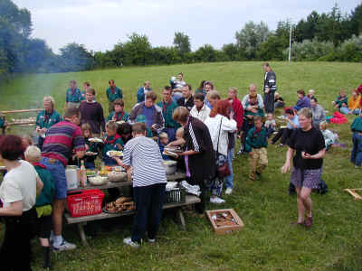 Mens nogle er på hike foregår der stadig noget i lejren. Her er spejdertroppens ledere i gang med at lave frokostbrød med ulvene. Man tager dejen og pakker pålægget ind i dejen. Derefter bages det over bålet til dejen er færdig. Spises mens det er varmt.