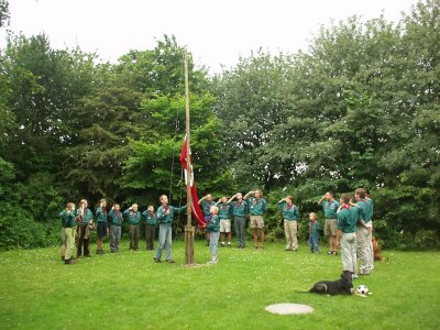 Transporten til Stevns foregik i en lejet bus, og da vi ankom til lejren, blev flaget sat første gang.