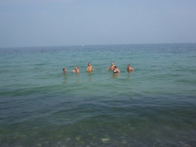 Troppen fik en velfortjent tur i vandet. Stranden var desværre meget stenet, derfor står alle samlet på det eneste sted med sandbund,